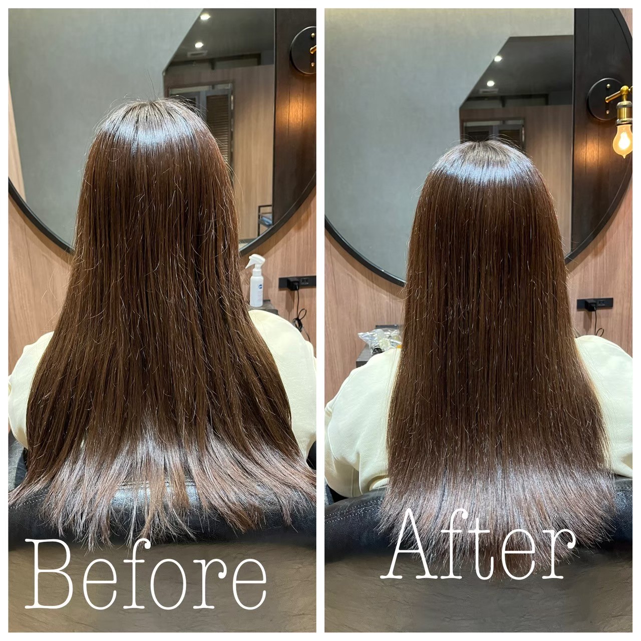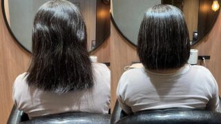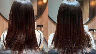 お仕上がりは、毛先までストンと落ち着き、光を一定に反射する滑らかな艶髪になりました。 写真でもわかる通り、手触りも柔らかく、見た目にも潤いを感じる質感に復活しています。