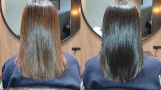 【原因】 原因は、髪の内部の水分バランスが崩れ、一本一本が歪んで乾燥してしまっていたことによるものでした。クセによって表面に凹凸ができることで光が乱反射し、ツヤが見えにくい状態になっていました。