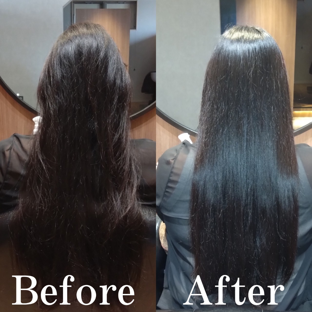 【現在の髪の状況】 お仕上がりは、気にされていたうねりが根元から毛先まで綺麗に収まり、鏡のように光を反射する艶髪になりました。 写真でもわかる通り、ボリュームがコンパクトにまとまり、ロングヘアの美しさが際立つ滑らかな質感に仕上がっています。